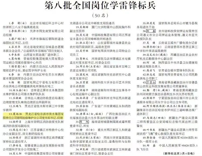 为贯彻落实习近平总书记关于深入开展学雷锋活动的重要指示精神,中央宣传部近日命名第八批全国学雷锋活动示范点50个、岗位学雷锋标兵50名。哈尔滨供水集团管网抢修维护分公司党支部书记、经理夏远征获评全国岗位学雷锋标兵。