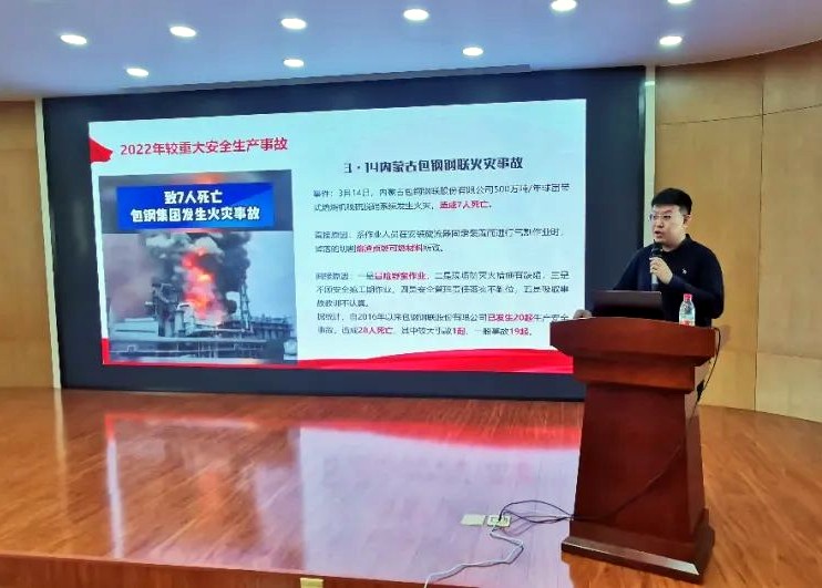 会上,全体干部员工共同观看了《奋斗新的伟业》系列专题片——《以新安全格局保障新发展格局》,重温了党的二十大报告中习近平总书记关于推进国家安全体系和能力现代化,坚决维护国家安全和社会稳定,坚定不移贯彻总体国家安全观的重要部署。王博副教授紧密围绕“坚持党的领导、贯彻新思想新理念、健全安全生产责任体系、明确安全生产职责、强化安全生产考核,以及构建双重预防机制、强化危险作业风险防范、加强应急救援队伍建设”等法治要求,进一步阐明了全面贯彻落实习近平总书记关于安全生产工作的一系列重要指示精神,推进安全生产“双重预防”机制建设,提升安全生产工作站位,强化企业安全生产主体责任以及严格遵守《条例》的重要性。