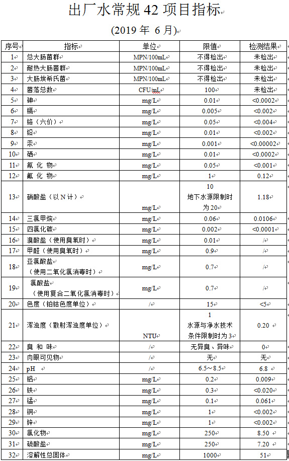 2019年6月出厂水常规42项目指标
