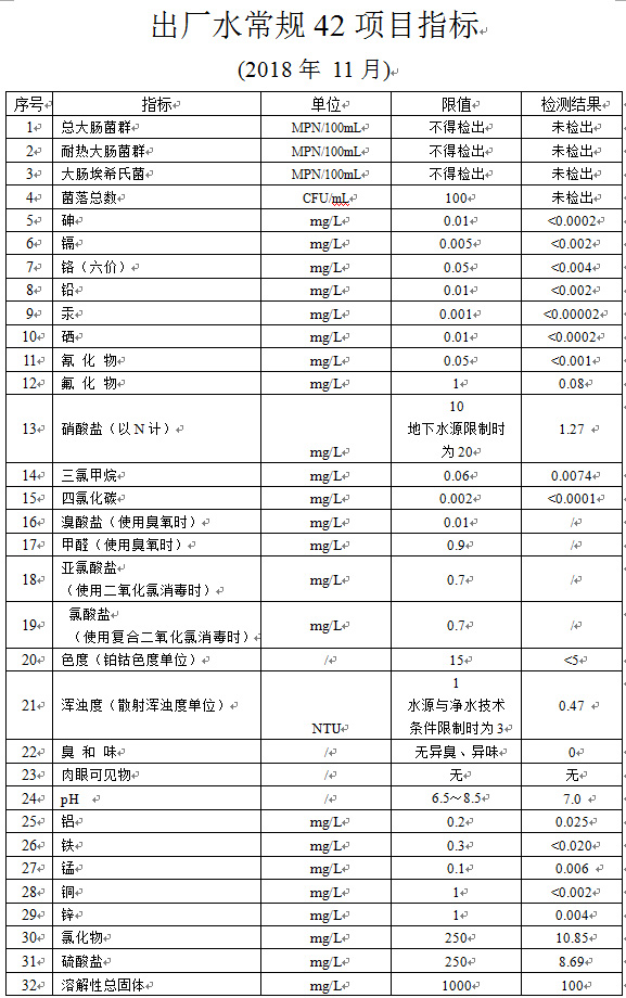 出厂水常规42项目指标 (2018年 11月)