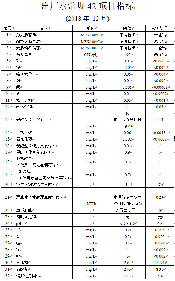 出厂水常规42项目指标 (2018年 12月)